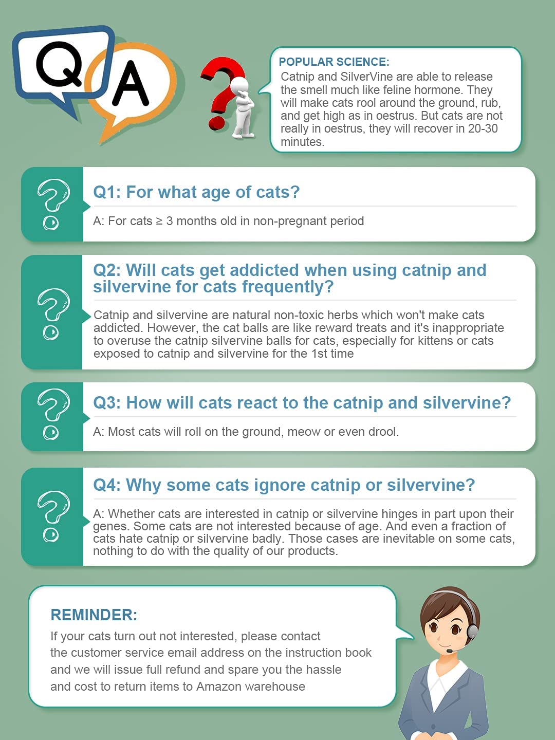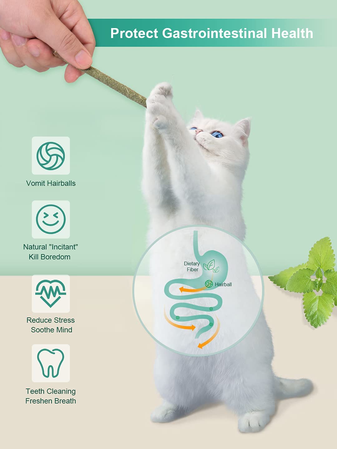 - Variety of Benefits: Silvervine and catnip have different benefits for cats. Silvervine protects gingiva of cats, by effectively eliminating dental plaque and tartar to clear off fetid breath and improve oral health. Catnip is good in promoting intestinal peristalsis to improve digestion and keep your fur babies healthy. In addition, they also make your cats feel calm and relaxed. The healthier your cats are, the closer you get together;