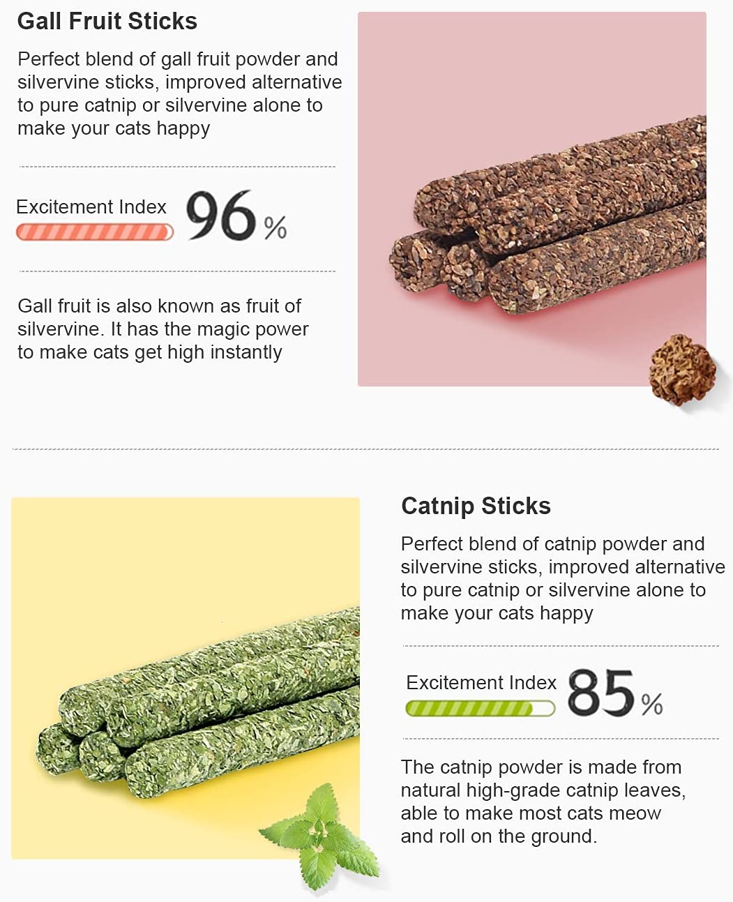 - 12Pcs Set, 3 Flavor Choices: 6Pcs silvervine sticks coated with catnip and 6Pcs silvervine sticks coated with fruit of silvervine, 3 different flavors for cats to lick and chew. Some cats love silvervine, some love catnip, some love fruit of silvervine and some love them all. You might not know which one your fur babies love (or love better), but the blend of 3 different flavors could be the great alternative, most likely to arouse your cats’ interest to lick and chew;
