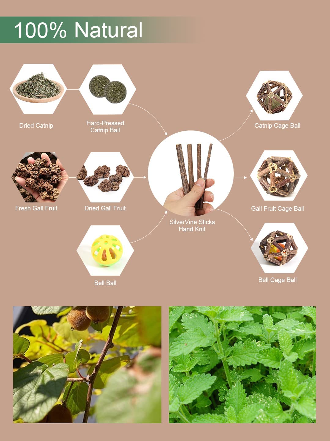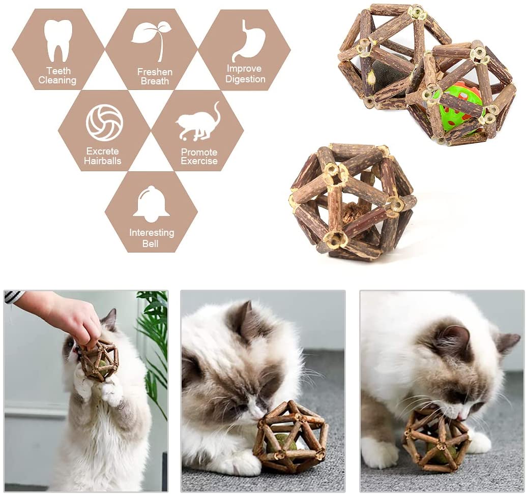 - 😻【Guaranteed 100% Organic】Our cat cage balls are made from all natural silvervine sticks, catnip and gall fruit without any additives. Silvervine, also named Matatabi, grows in wild jungles of southeast Asia. Gall Fruit is dried fruit of silvervine. Catnip is a perennial herb native to Central Asia. What’s more, the cages are 100% hand-woven with no chemical adhesives, thus cat’s health and safety is absolutely assured