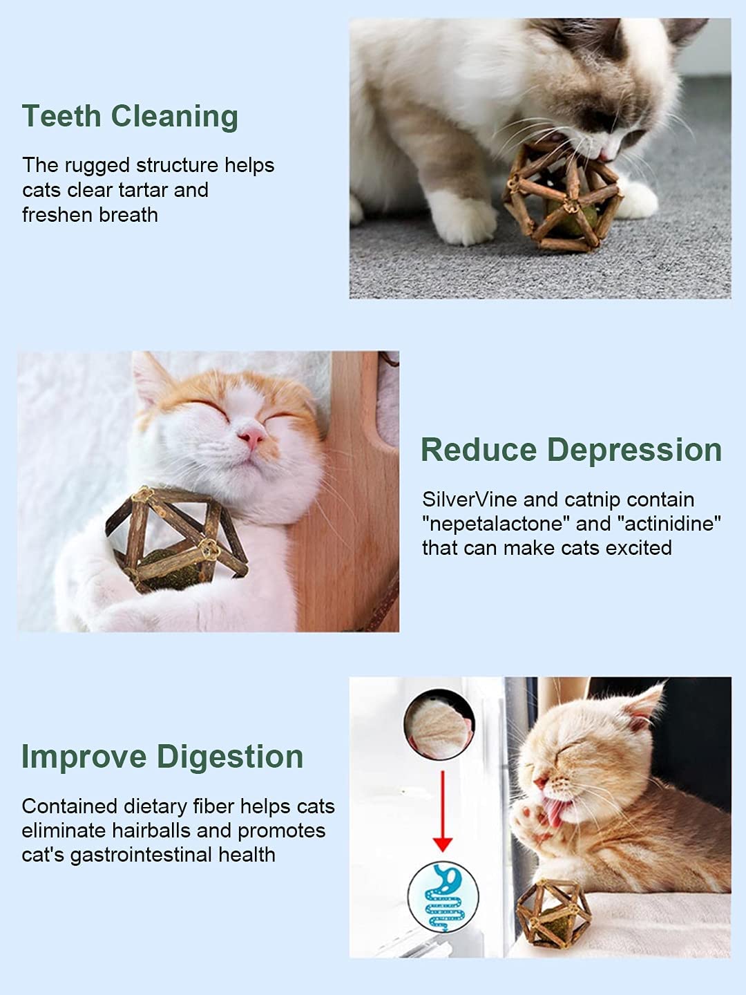 - 😻【Promote Digestion】Catnip, silvervine and gall fruit contain rich dietary fiber, which promote gastrointestinal motility, help get rid of hairballs and improve digestion. If your cats lose interest after playing for some time, you can cut off the exterior of silvervine sticks to intensify aroma, making the balls as appealing as new toys